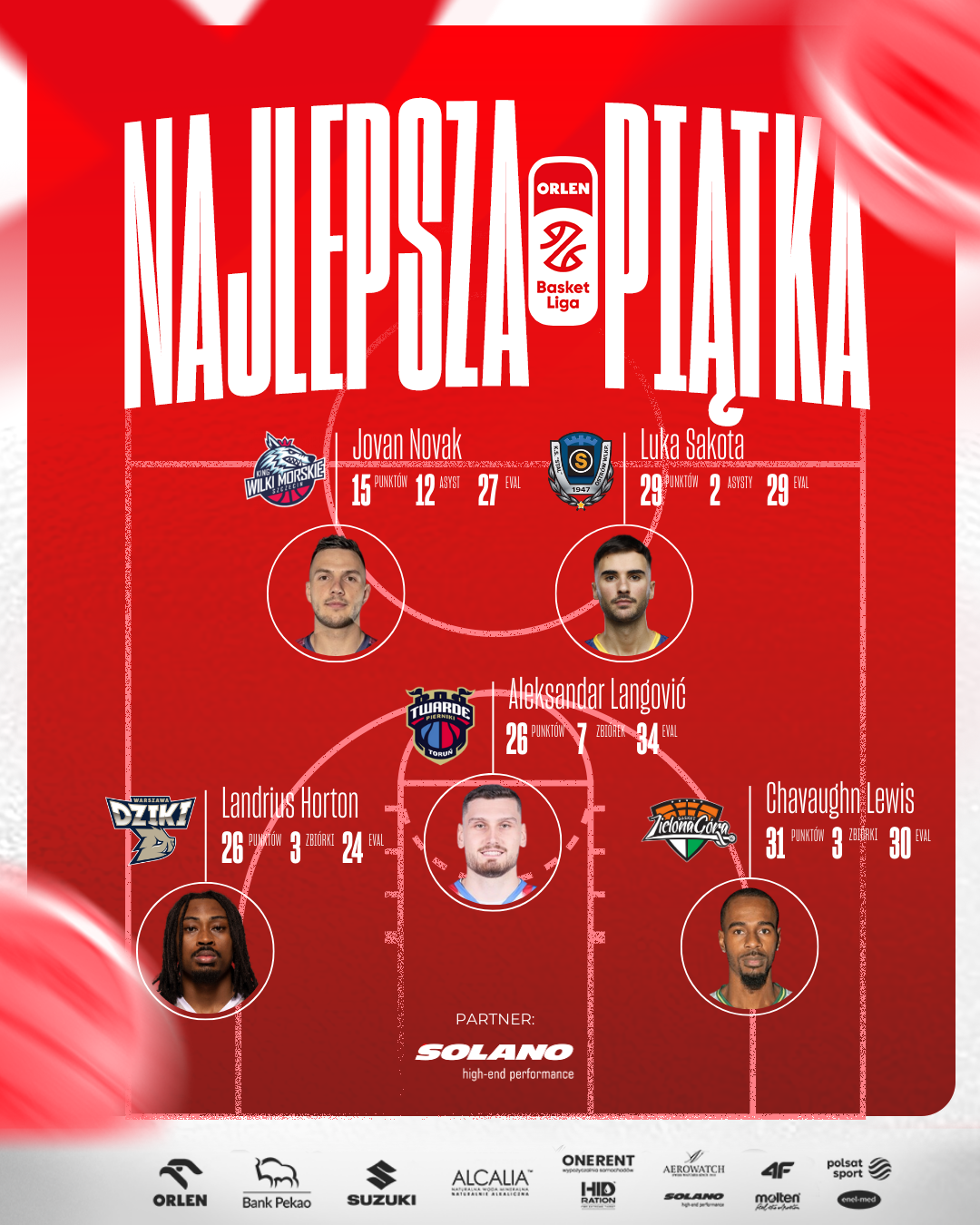 Jovan Novak, Luka Sakota, Landrius Horton, Chavaughn Lewis, Aleksandar Langović - to najlepsza piątka 12. kolejki ORLEN Basket Ligi w sezonie zasadniczym 2025/26.
