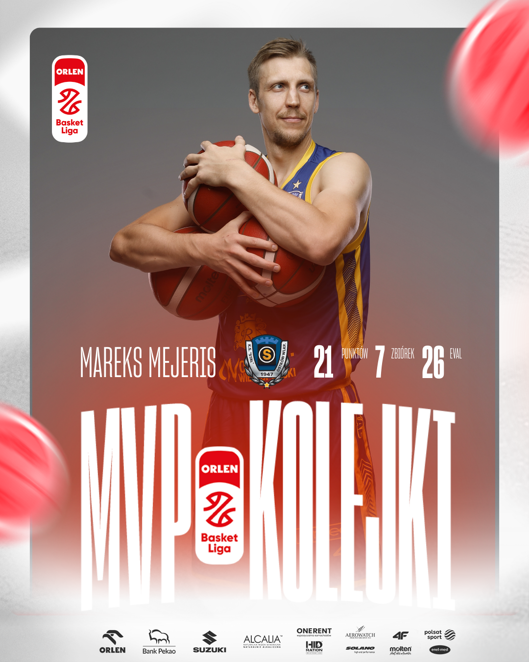Mareks Mejeris z Tasomix Rosiek Stali Ostrów Wielkopolski to MVP 14. kolejki ORLEN Basket Ligi w sezonie 2025/26.