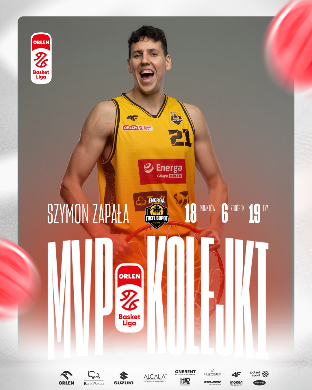Szymon Zapała z Energa Trefla Sopot to MVP 15. kolejki ORLEN Basket Ligi w sezonie 2025/26.