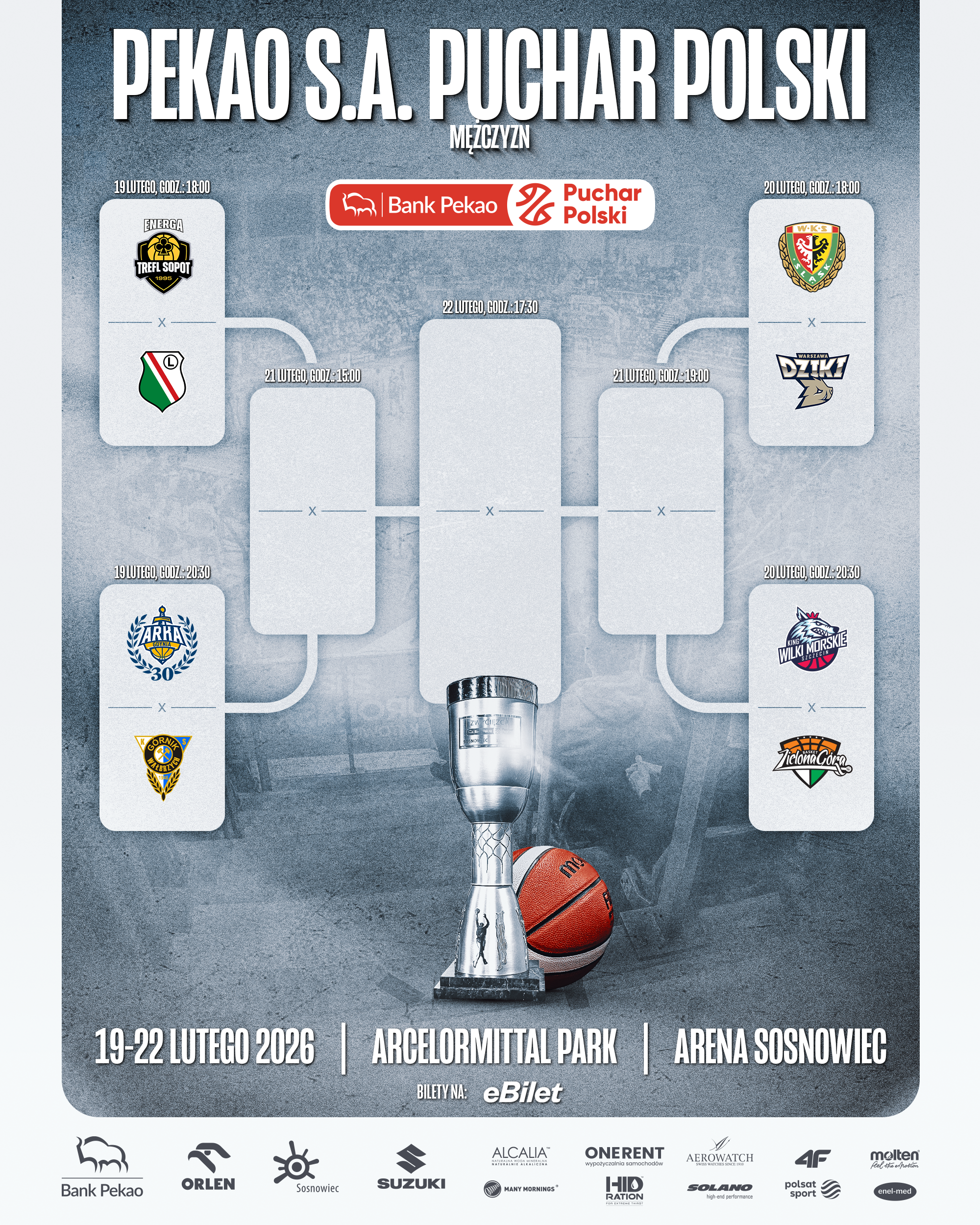 Turniej finałowy Pekao S.A. Pucharu Polski zostanie rozegrany już od 19 do 22 lutego 2026 r. w Arenie Sosnowiec, wchodzącej w skład ArcelorMittal Park. Podczas losowania w studio Polsat Sport poznaliśmy pary ćwierćfinałowe i układ półfinałów. Od początku na kibiców czekają wielkie koszykarskie emocje!
