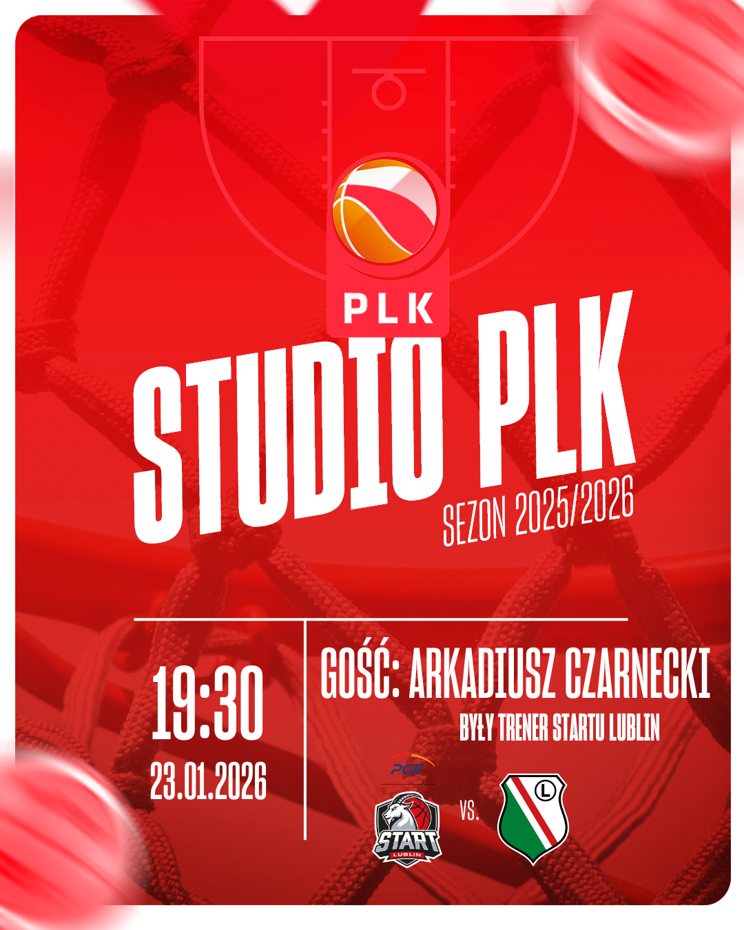 Kolejna odsłona “Studia PLK” na YouTube już podczas piątkowego spotkania 17. kolejki ORLEN Basket Ligi PGE Start Lublin - Legia Warszawa, Od godz. 19:30 gościem specjalnym będzie Arkadiusz Czarnecki, były trener drużyny z Lublina.