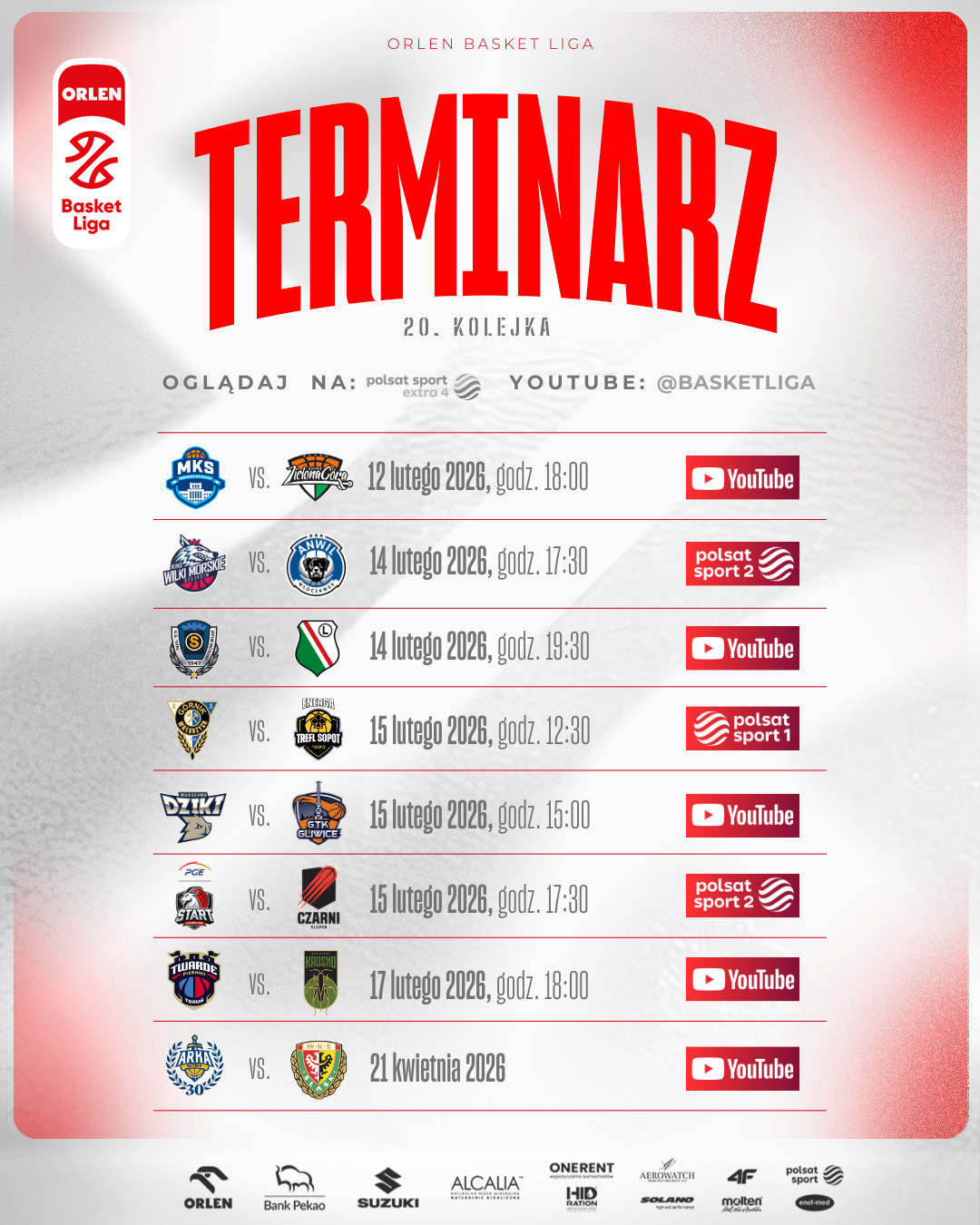 20. kolejka ORLEN Basket Ligi jest ostatnią przed turniejem finałowym Pekao S.A. Pucharu Polski! Kto pokaże najlepszą formę? Cztery transmisje będzie można zobaczyć na kanale YouTube OBL, a trzy kolejne w sportowych stacjach Polsatu. Wszystkie spotkania dostępne są także w Polsat Sport Extra 4.