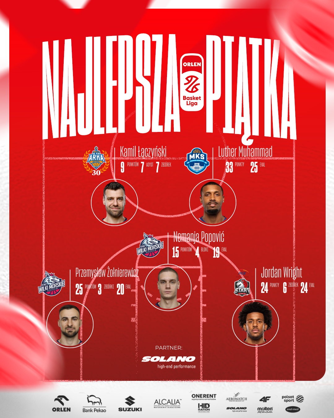 Kamil Łączyński, Luther Muhammad, Jordan Wright, Przemysław Żołnierewicz, Nemanja Popović - to najlepsza piątka 22. kolejki ORLEN Basket Ligi.