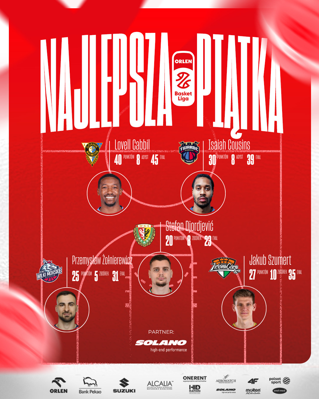 Lovell Cabbil, Isaiah Cousins, Przemysław Żołnierewicz, Jakub Szumert, Stefan Djordjević - to najlepsza piątka 23. kolejki ORLEN Basket Ligi w sezonie 2025/2026.