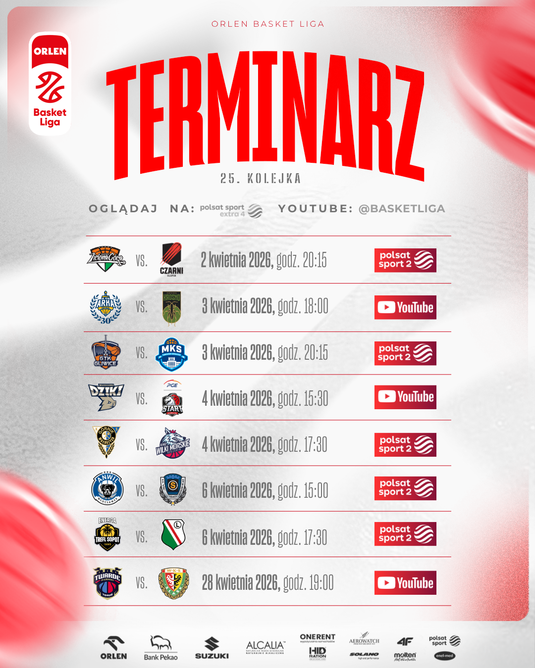 Przed nami 25. kolejka ORLEN Basket Ligi, która rozgrywana będzie w okresie Świąt Wielkanocnych! Szczególnie polecamy mecze poniedziałkowe - Anwil zagra z Tasomix Rosiek Stalą, a Energa Trefl podejmie Legię. Oba starcia będzie można oglądać w Polsat Sport 2.