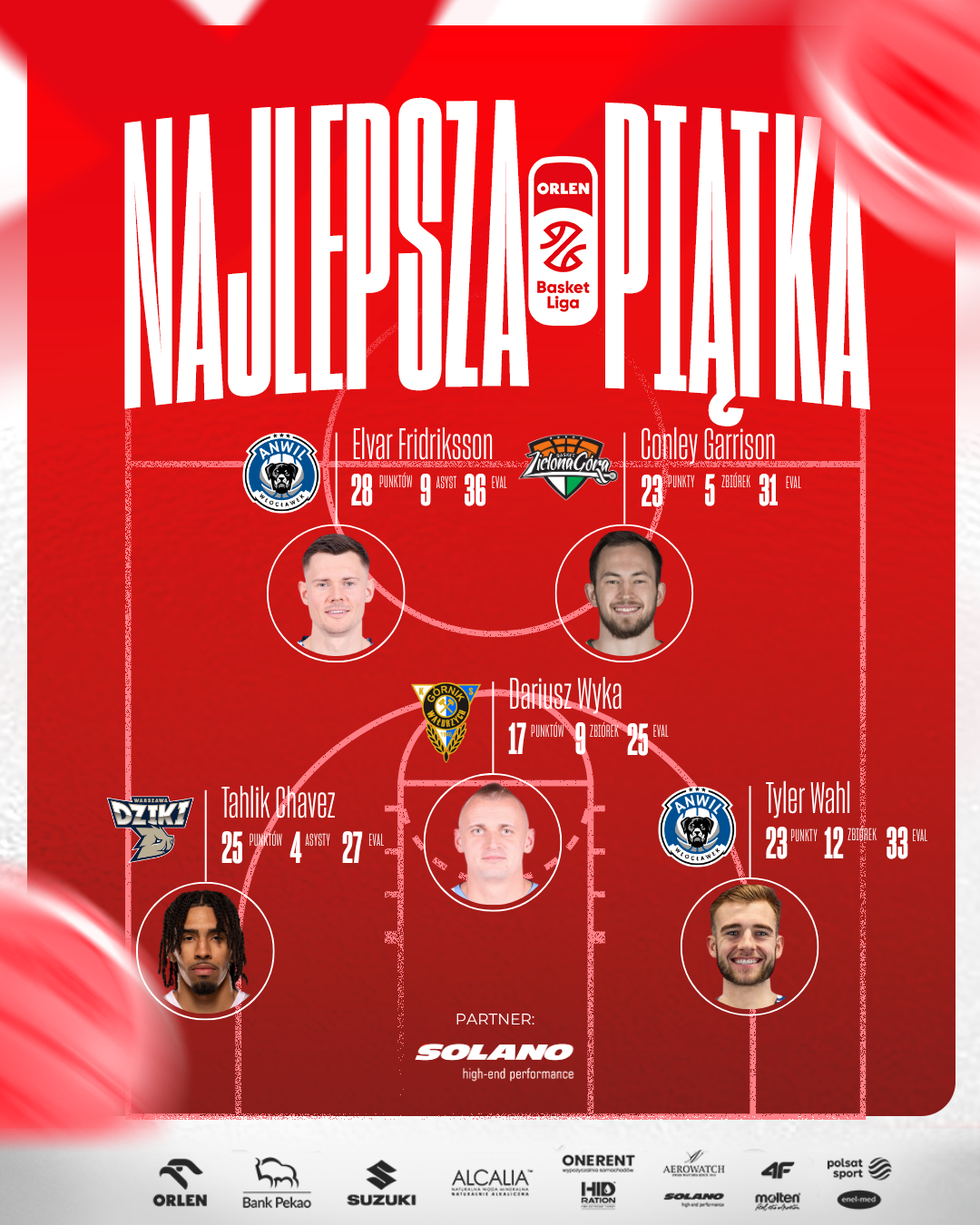 Elvar Fridriksson, Conley Garrison, Tahlik Chavez, Tyler Wahl, Dariusz Wyka - to najlepsza piątka 21. kolejki ORLEN Basket Ligi w sezonie 2025/26.