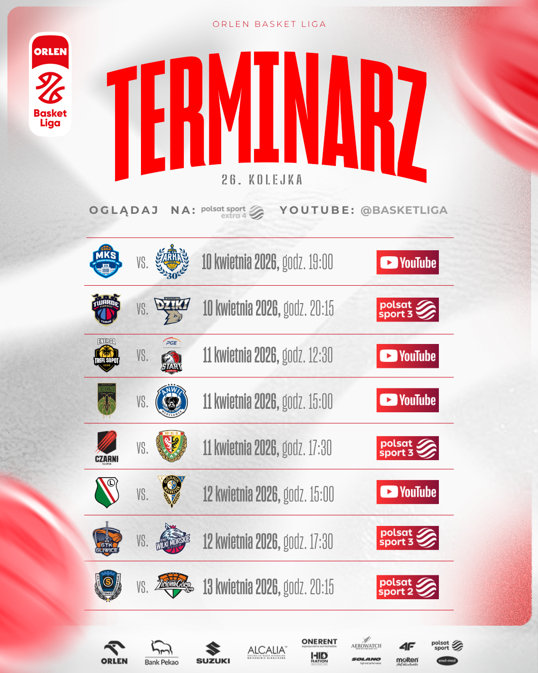 Kolejne emocje w ORLEN Basket Ligi od piątku do poniedziałku! Tradycyjnie cztery spotkania będzie można zobaczyć w sportowych stacjach Polsatu, a cztery kolejne - bezpłatnie - na oficjalnym kanale YouTube OBL.