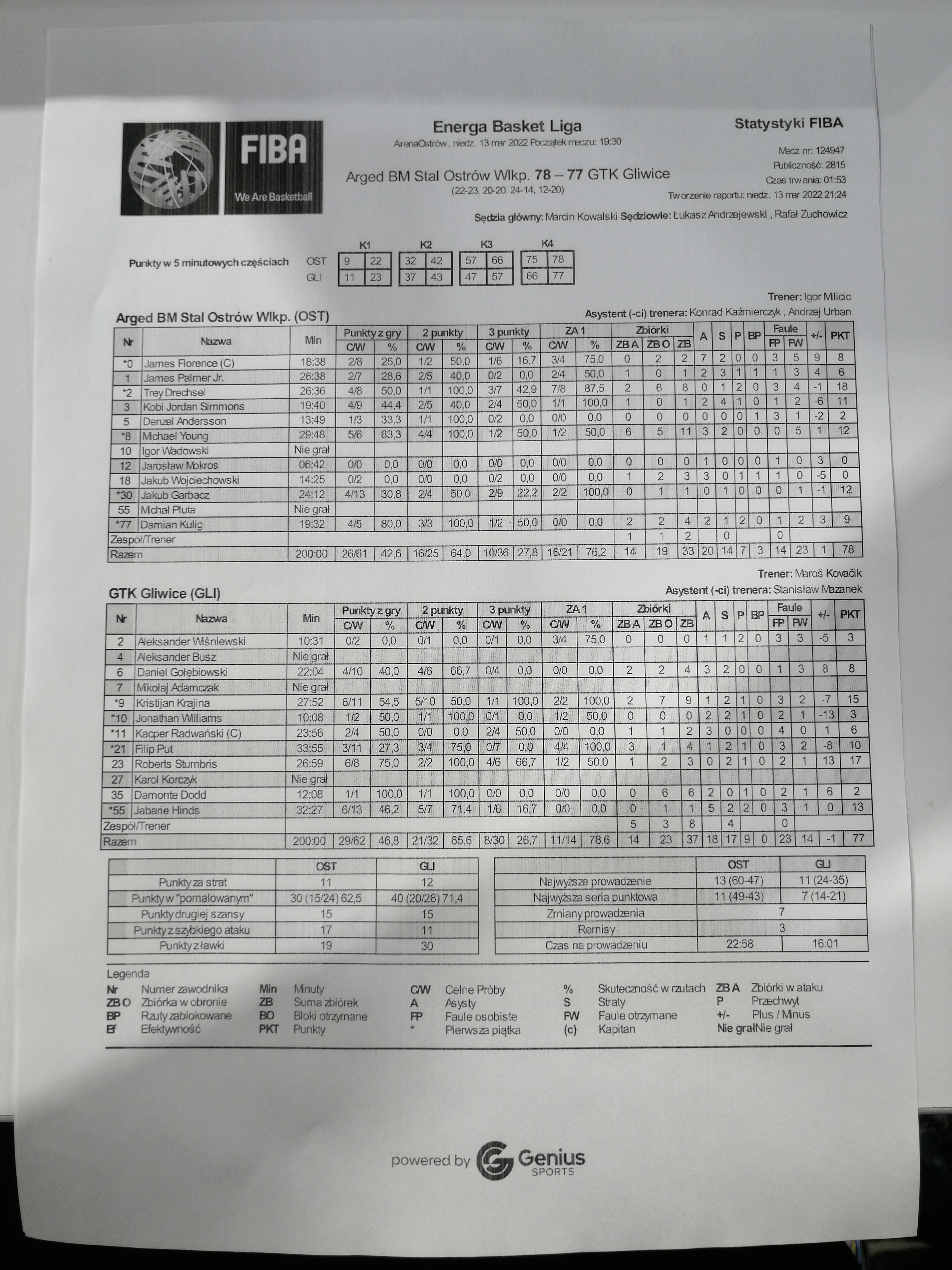 3mk Arena Ostrów, Andrzeja Kowalczyka 1, 63-400 Ostrów Wielkopolski 22:23