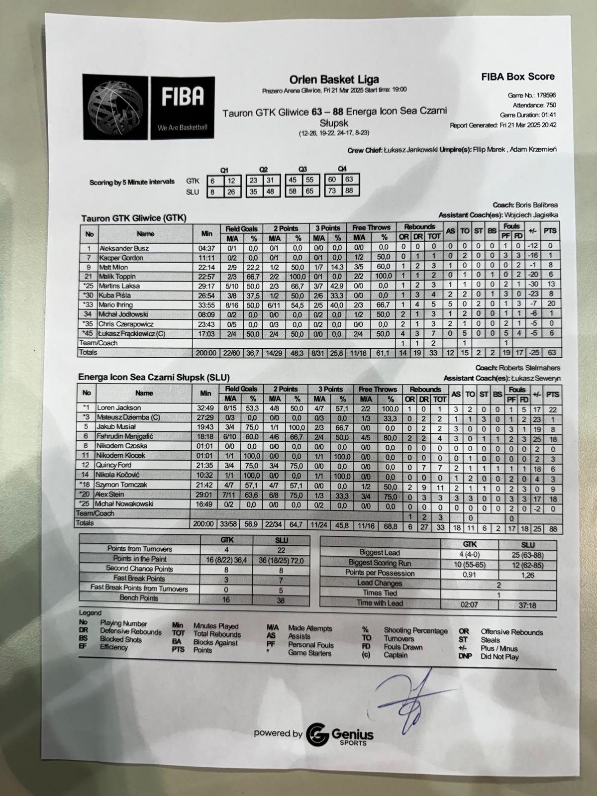 Runda Zasadnicza - 22 kolejka 21.03.2025 / 19:00Prezero Arena Gliwice, Akademicka 50, 44-100 Gliwice12:26/19:22/24:17/8:23