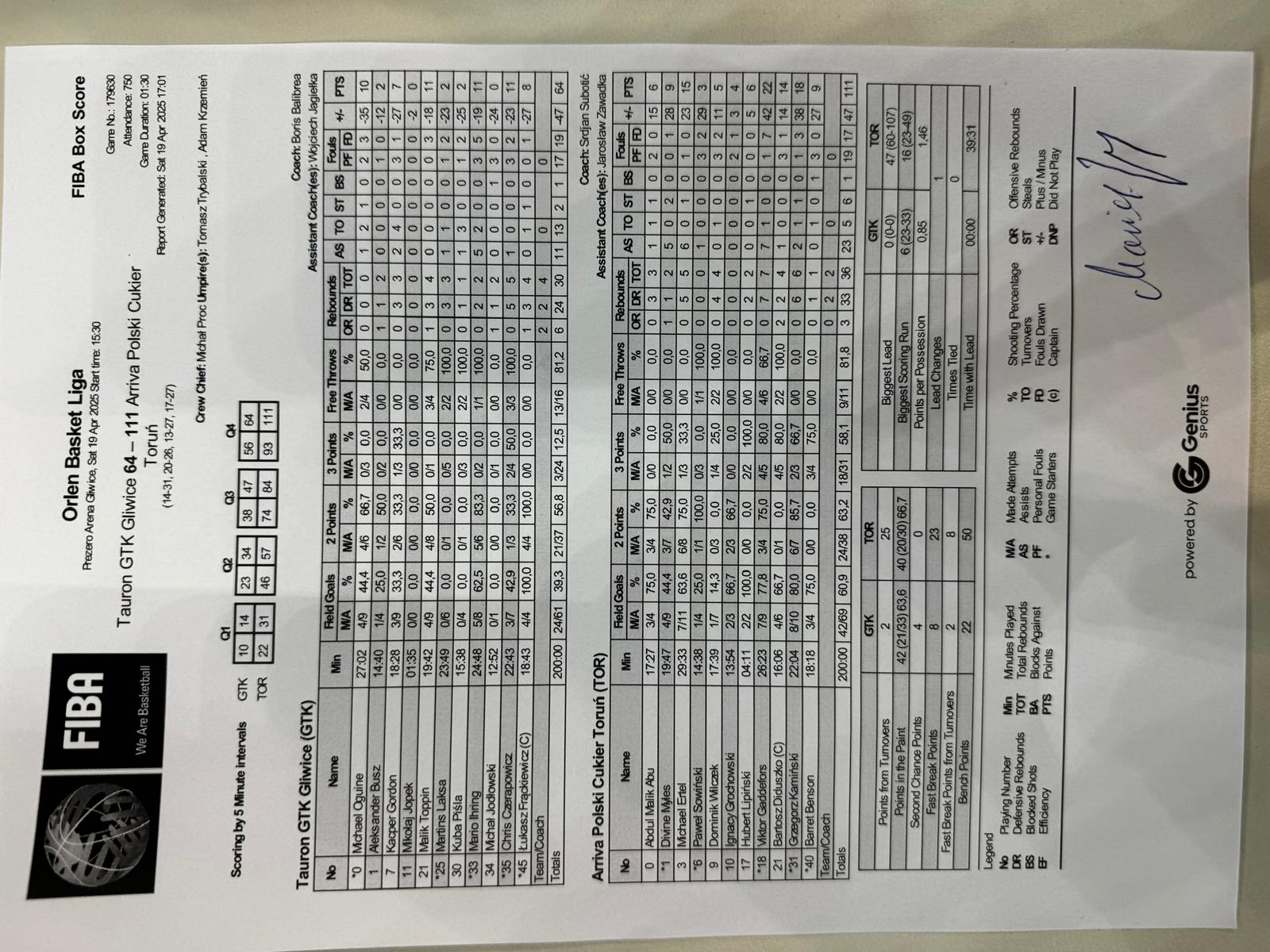 Runda Zasadnicza - 26 kolejka 19.04.2025 / 15:30Prezero Arena Gliwice, Akademicka 50, 44-100 Gliwice14:31/20:26/13:27/17:27