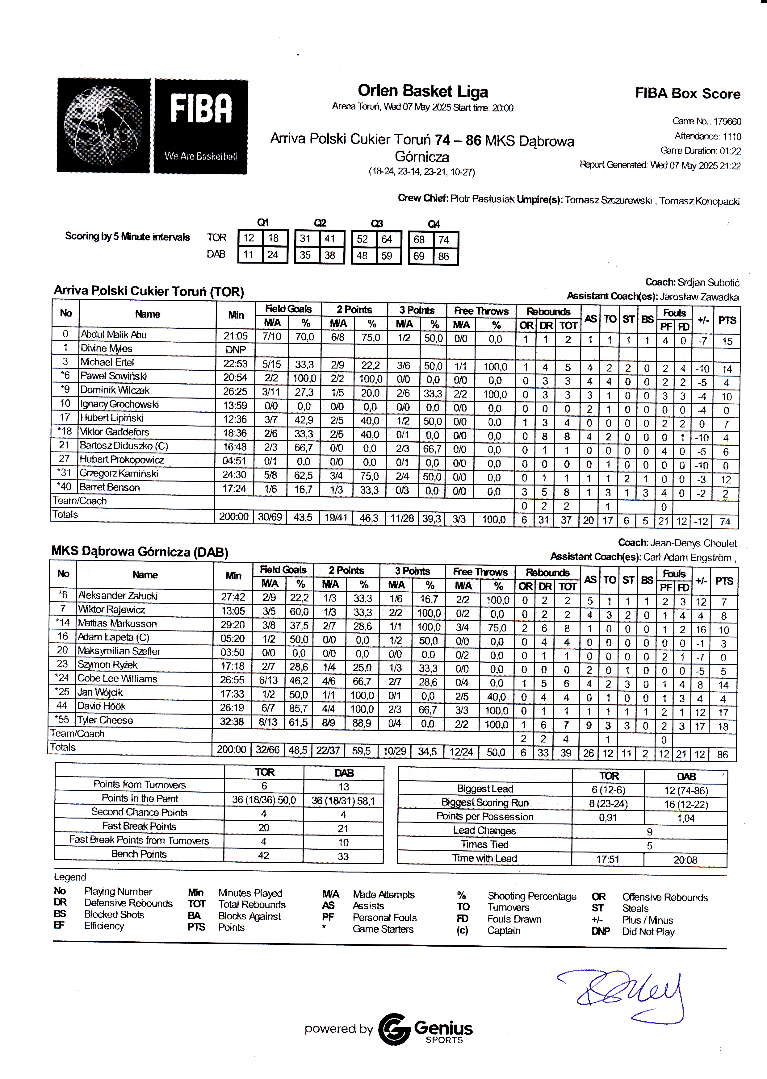 Runda Zasadnicza - 30 kolejka 7.05.2025 / 20:00Kujawsko-Pomorska Arena Toruń, ul. Gen. J. Bema 73-89, 87-100 Toruń18:24/23:14/23:21/10:27